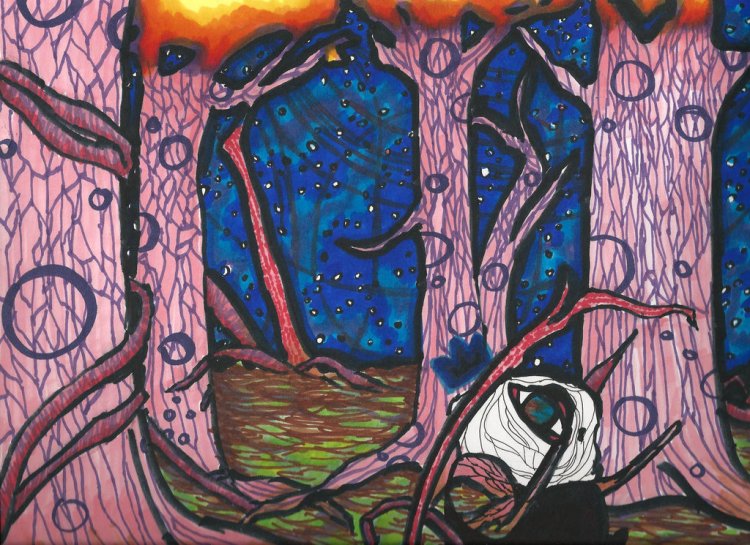 Through the Cosmic Woods (2015 Pastel Marker on Paper 12″ x 9″) – $90